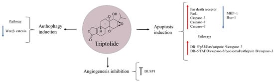 - Qin, W.; Li, S.; Miao, Y.; Shi, Q.; Wang, Y.; Li, J.; Chen, Z.; Wang, J.; Ling, C. Triptolide induces mitochondrial apoptosis through modulating dual specificity phosphatase 1/mitogen-activated protein kinases cascade in osteosarcoma cells. Neoplasma 2018, 65, 21–33. [Google Scholar] [CrossRef] [PubMed]