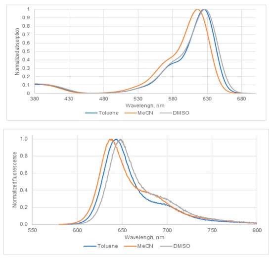 The electronic absorption and fluorescence spectra of BODIPY 1 in three common organic solvents of different polarities and polarizabilities are shown in Figure 1.