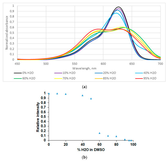 Many applications in medicine and biology, such as fluorescence labeling or sensing, require operation in an aqueous solution. Therefore, studies of the optical properties of BODIPY 1 in H2O were performed. Due to the hydrophobic nature of dye 1, DMSO was used as a co-solvent. The absorption and fluorescence spectra of BODIPY 1 in the DMSO–H2O mixture with an incremental amount of water from 0 to 95 vv% are presented at Figure 3a. It is clearly seen that in a mixture of DMSO–H2O, a typical aggregation effect [59,60] took place: absorption spectra and fluorescence intensity first remained almost unchanged with increasing water content, and then changed dramatically when a certain content of water was reached. The threshold reflects the starting point of the aggregation of hydrophobic dye. After the aggregation begins, a small increase in water content caused significant fluorescence quenching (Figure 3b). In our case, a significant change in the shape of the absorption spectrum and a considerable decrease in the fluorescence intensity were observed at a water content >50%. At >95% water content, BODIPY 1 practically did not fluoresce.