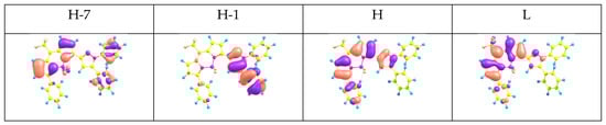 As in other meso-CF3-BODIPY dyes with aryl substituents at the positions 3 and 5 [46,47,53,57,61,62,63,64,65], most long-wave S0 → S1 absorption bands and slightly Stokes-shifted S1 → S0 respectively to the fluorescence bands, are due to the π-π* one electron excitation from the HOMO to LUMO (Table 2). These band shoulders (Figure 1) could be assigned to vibrational bands of the same transitions [66]. The significantly weaker absorption bands located in the experimental spectra above 450 nm could be assigned to the envelopes of S0 → S2 and S0 → S3 transitions of the charge-transfer character (Figure 4). It is of note that there is a large energy gap between the strong main S0 → S1 transition and the next very weak S0 → S2 and S0 → S3 transitions (Table 2). This is consistent with a high experimental ΦF in organic solvents (Table 1) [67].