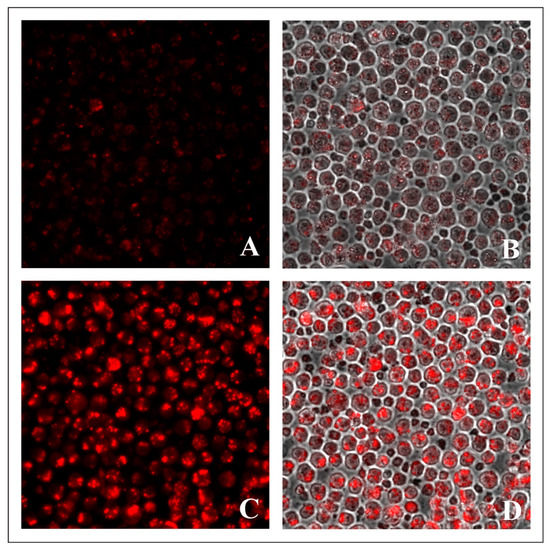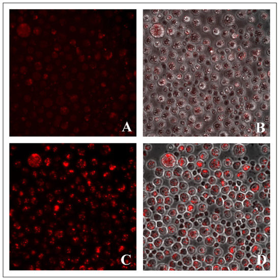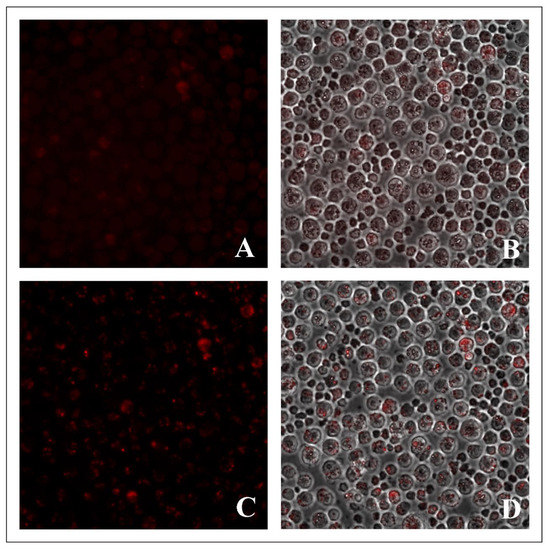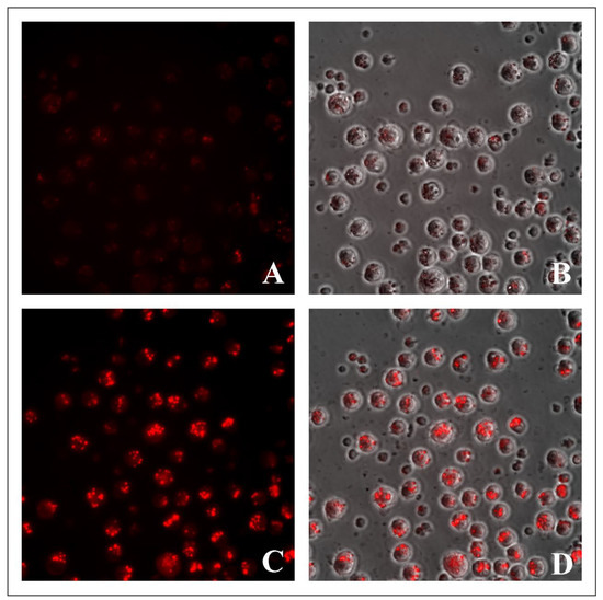 The most intense fluorescence was observed in ascites carcinoma cells, when treated with 100 μM BODIPY for 24 h. In this case, the visualized cells’ fluorescence spread to most parts of the cytoplasmic volume (Figure 8C,D), which indicates that the number of intracellular elements stained with the dyes had significantly increased; in addition, the observed fluorescence may have been the result of the fusion of intracellular vacuolar structures, containing BODIPY.