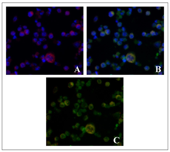 Fluorescent microscopic images showing colocalization of lysosomal markers LAMP1 and BODIPY 1 in Ehrlich ascitic carcinoma cells: (A)—BODIPY 1 (red) and nuclei (blue), (B)—LAMP1 (green) and nuclei (blue), (C)—overlapping BODIPY 1 and LAMP1 fluorescent staining. Magnification 40×.