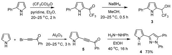 The approach to BODIPY 1 includes as a key step the assembly of dipyrromethane 2 from two molecular counterparts: 2,2,2-trifluoro-1-(5-phenylpyrrol-2-yl)ethan-1-ol 3 and pyrrolyl-pyrazole 4 as OH and CH components, respectively (Scheme 1). 2,2,2-Trifluoro-1-(5-phenylpyrrol-2-yl)ethan-1-ol 3 was obtained according to the procedure in [53]. For the synthesis of pyrrolyl-pyrazole 4, the cross-coupling of pyrrole with benzoylbromoacetylene in solid Al2O3 [54,55,56] was followed by the treatment of 2-benzoylethynylpyrrole 5 thus formed with phenylhydrazine (Scheme 1). The formation of pyrrolyl-pyrazole was carried out with slight heating up to 40 °C of 2-benzoylethynylpyrrole with 1.5 (Scheme 1) of phenylhydrazine in EtOH overnight.