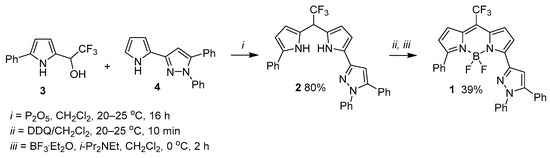 The reaction of trifluoropyrrolylethanol 3 with pyrrolyl-pyrazole 4 was carried out in the presence of an equimolar quantity of P2O5 to give dipyrromethane 2 in an 80% yield (Scheme 2). The final stage, oxidation of dipyrromethane with DDQ followed by complexation of the formed dipyrromethene with BF3 etherate, was realized as a one-pot procedure, to afford the target BODIPY dye 1 in a 39% yield (Scheme 2).