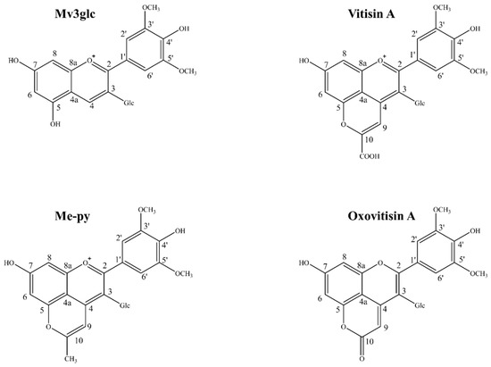The spectral properties of oxovitisin A, vitisin A, Me-py, and Mv3glc were characterized in relation to temperature, pH, and bisulfite decoloration. In all the assays, oxovitisin A had the highest stability compared with its precursors and Me-py.