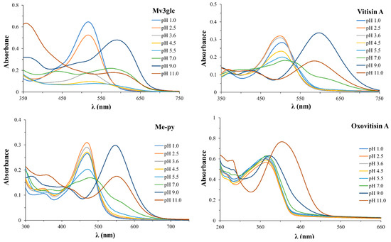 UV–VIS spectra of Mv3glc, vitisin A, Me-py, and oxovitisin A at different pH values (1.0–11.0).