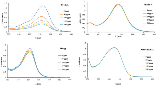 Visible spectral of Mv3glc, vitisin A, Me-py, and oxovitisin A under different concentrations of bisulfite.