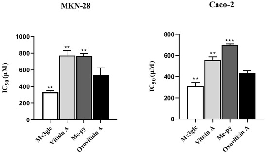 Antiproliferative abilities of Mv3glc, vitisin A, Me-py, and oxovitisin A against MKN-28 and Caco-2 cell lines in vitro. Each value represents the means ± SEM (n = 6). ** p < 0.01, *** p < 0.001 vs. oxovitisin A.