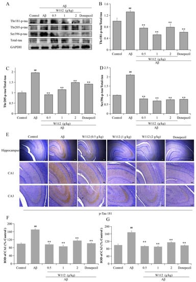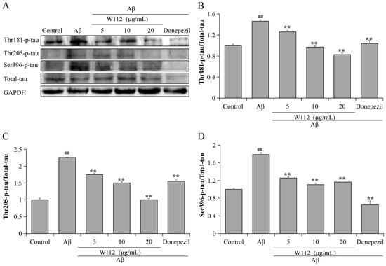 2.3. Effects of W112 on Aβ25–35-Induced Tau Hyperphosphorylation