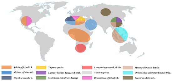 Geographical representation of the worldwide distribution of different Lamiaceae plants.