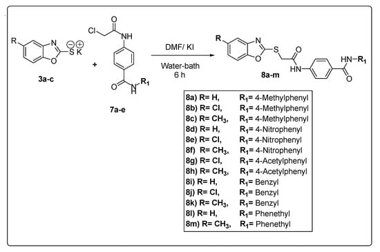 - Kaul, S.; Kumar, A.; Sain, B.; Bhatnagar, A.K. Simple and Convenient One-Pot Synthesis of Benzimidazoles and Benzoxazoles using N,N-Dimethylchlorosulfitemethaniminium Chloride as Condensing Agent. Synth. Commun. 2007, 37, 2457–2460. [Google Scholar] [CrossRef]