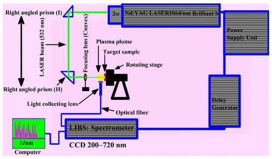 Laser-induced breakdown spectroscopy (LIBS) can be considered an efficient, reliable, non-destructive, and versatile analytical technique, with potential applications in industry, scientific research, environmental and biological fields, and agriculture [1,2,3,4,5,6]. In the LIBS technique, the plasma emission spectra of the target sample are investigated. The plasma generated at the surface of the target, such as gas, liquid, and solid, is normally generated when the high-power laser beam is focused onto the target material [7,8,9]. The plasma emission spectrum from the laser-produced plasma gives the optical fingerprints of the sample ingredients [10,11]. LIBS is a fast, real-time, and cost-effective technique that could investigate the multiple ingredients present in the target sample both quantitatively and qualitatively [12]. However, traditional methods for compositional analysis of the samples mainly include X-ray fluorescence spectroscopy (XRF) [13], inductively coupled plasma mass spectrometer (ICP-MS) [14], inductively coupled plasma-atomic emission spectroscopy (ICP-AES) [15], and atomic-absorption spectroscopy (AAS) [16].