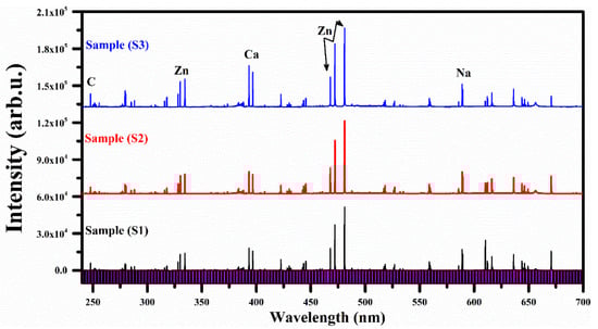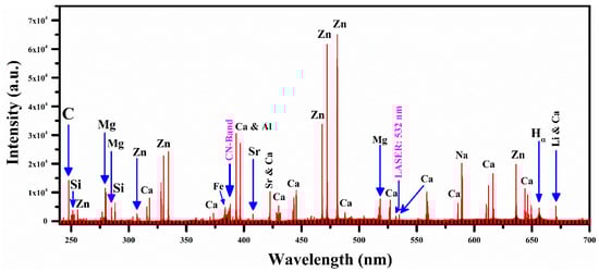 The emission spectra of the three plant-biochar samples were registered at optimized experimental conditions, including 90 mJ laser pulse energy, 0.018 GW power, 10 cm focal length of the laser beam focusing convex lens, 2 mm distance from the plasma plume to the light collecting lens and the target surface was held perpendicular to the laser light beam. The laser pulse was collimated onto the pallets of the target samples to produce the plasma at a ~90 mJ laser energy. The plasma optical emission spectrum from the laser-generated plasma was captured using a CCDs spectrometer. The spectrum was further investigated by labeling the spectral lines identified using the National Institute of Standards and Technology (NIST) database [32] and LIBS info [33]. The optical emission spectral lines of various elements with different line intensities were detected in the emission spectra of the plant-biochar samples, whereas rich emission lines of zinc (Zn) around 325 nm and 475 nm were identified in all three samples. Therefore, only one spectrum in the wavelength range from 240–700 nm is presented in Figure 2, which shows the strong as well as weak emission lines, including elements lithium (Li), hydrogen (H), sodium (Na), calcium (Ca), aluminum (Al), iron (Fe), carbon (C), strontium (Sr), zinc (Zn), and silicon (Si), along with a multiplet cluster of singly ionized magnesium (Mg II), due to the 3p 2P1/2,3/2 → 3s 2S1/2 and 3d 2D3/2,5/2 → 3p 2P1/2,3/2 transitions. The detected emission spectral lines of various elements present in the plant biochar sample (S1) are enlisted in Table 1.