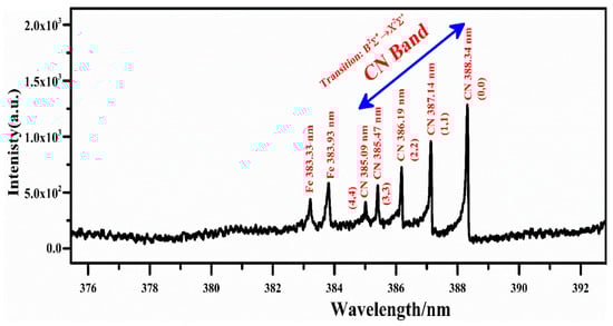 CN molecular emission spectrum due to the vibrational transitions; (0-0), (1-1), (2-2), (3-3) and (4-4), with a wavelength range from 375 nm to 393 nm.