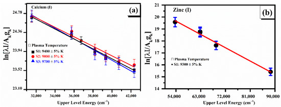The plasma excitation temperature was approximated from the relative plasma emission line intensities of the neutral calcium (Ca) line profiles for samples (S1, S2 and S3) using the Boltzmann equation. The neutral zinc (Zn) emission line profiles for sample S1 were also used to calculate the plasma excitation temperature using the same Boltzmann plot method. The spectral emission lines utilized to structure the Boltzmann plots are shown in Table 2. The spectroscopical atomic parameters, such as optical wavelength (nm), upper-level energy (cm−1), transition probability (s−1), and statistical weight (gk), were used from the NIST database [32]. Generally, errors in the plasma excitation temperature using the Boltzmann plot method occurs due to the uncertainties in the calculated line intensities and transition probabilities. Therefore, in the present study, the calculated plasma excitation temperature consists of about ~5% relative error. Self-absorption in LIBS analysis lowers line broadening and the line intensity of an emission line, due to the light radiated by an atom in a laser-produced plasma being absorbed by that atom in another section of the plasma. The self-absorption effect normally generates inhomogeneous plasma, which produces several strong fluctuating slumps on the emission spectrum. This effect leads to uncertainty in measuring the compositions using CF-LIBS. In this study, we have corrected the selected emission line intensities for CF-LIBS to minimize the self-absorption effect, which is less than 5% [36,37].