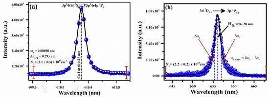 The plasma electron number density is approximated using an isolated Stark-broadened Ca I spectral line at wavelength 610.27 nm and the Stark-broadened emission line profile of the hydrogen (Hα) at wavelength 656.28 nm. The full width at half maxima, Δλ1/2 (FWHM), of Ca and Hα spectral lines was obtained by the deconvolution process using the Voigt fitting line profile with instrumental width (0.05 ± 0.01 nm), the Doppler width (0.005 nm) and the Stark width (ωs). The relation for the Stark width in terms of plasma electron density and FWHM is given as follows [40,41]: