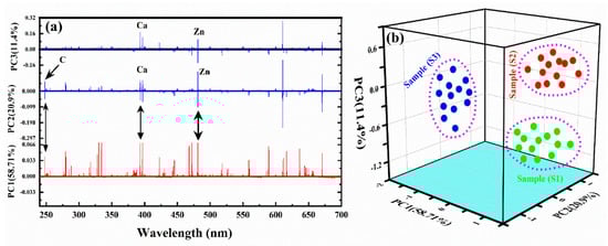 (a) The loading plots of the first 3 PCs, (b) 3D plot of the intensity of Zn (I) at wavelength 481.05 nm, Ca (II) at wavelength 393.37 nm, and C (I) at wavelength 247.86 nm for S1, S2, and S3, respectively.