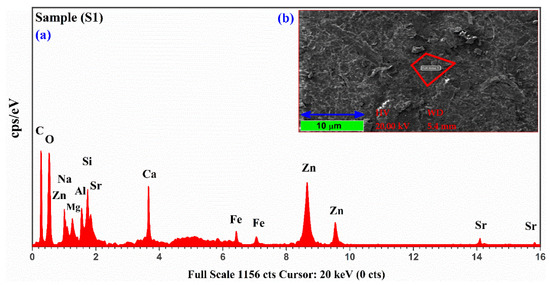 Energy dispersive X-ray (EDX) is a standard analytical method for the identification of trace ingredients in geological, mineralogical, and environmental samples. EDX can detect various elements, such as C, O, Si, Pb, Na, Mg, Al, Cu, Cl, Ni, K, Ca, Ti, Fe, P, Cr, Mn, Cd, Zn, As, Se, Ba, Sr, and Co, in soil and plants. The microphotograph and corresponding EDX spectrum were taken for all three samples (S1, S2 and S3). However, we present only one typical microphotograph and EDX spectrum of the sample (S1) in this study. In Figure 8a, we present the EDX spectrum of the plant-biochar sample (S1). Figure 8b shows the microphotograph of EDX, which was recorded using an accelerating voltage of 20 keV under a high vacuum (~10−7 mbar), along with a resolution up to 10 μm. The maximum magnification is around times higher than what is possible in this equipment with the high energy of ~130 eV. The EDX analysis shows the presence of C (21.44%), Na (2.58%), Mg (4.97%), Al (2.43%), Si (2.87%), Ca (27.88%), Fe (3.27%), Zn (31.89%), and Sr (2.67%) as the major (primary), minor (secondary), and trace (micro) nutrients of the plant-biochar sample (S1). Interestingly, elements detected by the LIBS technique are also present in the EDX spectrum except for Li, the lightest element with a low X-ray yield, as compared to the other detected components. After bombarding an accelerated (1–10 kV) beam of electrons onto the Li atoms, Li releases auger electrons instead of photons with discrete kinetic energies. Therefore, EDX is unable to detect the light elements; H, Li, Be, and B have a low X-ray yield.