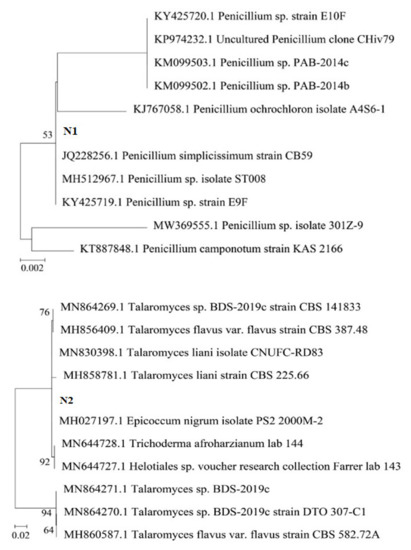The results show that strain N1 was closest to the species Penicillium genus (100% similarity), strain N2 had 100% similarity with the fungal strain of the Talaromyces genus, and strain N3 had a high similarity with the fungal strain of Trichoderma (100% similarity). The endophytic fungi strains were Penicillium simplicissimum CN7, Talaromyces flavus BC1, and Trichoderma konilangbra DL3, respectively.