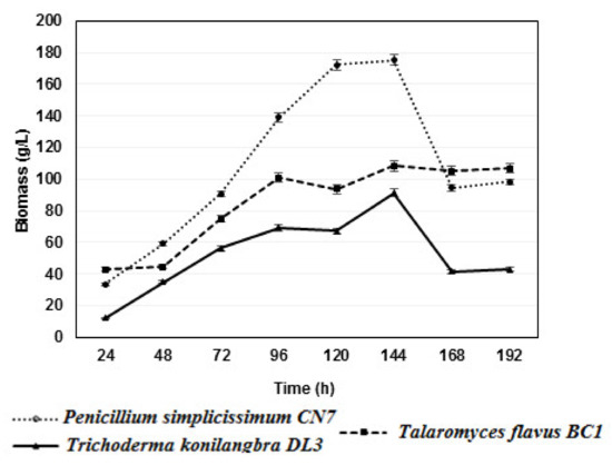 Based on the results, it was found that all three strains of fungi produced the highest biomasses at 144 h after the culture on PDB medium and shaking at 200 rpm at 30 °C, with the biomasses reaching 175.4 g/L for Penicillium simplicissimum CN7, 108.4 g/L for Talaromyces flavus BC1, and 91.2 g/L for Trichoderma konilangbra DL3. This result provides a significant contribution by demonstrating how to obtain strains in production and use them in practice (Figure 2). In this study, after 168 and 192 h, the fermentation pH tended to increase gradually, and the strains Penicillium simplicissimum CN7 and Trichoderma konilangbra DL3 formed pellets with small, smooth, tightly coiled spheres, which obstructed the respiratory process and affected the biological production growth of the fungal strains, while the filamentous Talaromyces flavus BC1 strain was less affected.