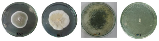 An evaluation of the ability to antagonize pathogenic fungal strains was carried out to determine the effect of inoculants in agriculture. Endophytic fungi and pathogenic fungi were co-cultured on PDA plates to investigate their antagonistic abilities. Antagonistic fungal strains inhibited the growth of pathogenic fungi (Figure 4).