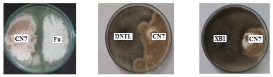 The antifungal activity of the 3 endophytic fungi against XB1 (L. thebromae N13), CD1 (C. gloeosporioides), Fu (F. oxysporum), and DNTL (N. dimidiatum) was determined by modifying the dual-culture plate antagonism. They were cultured on PDA plates at 25 °C for 7 days in the dark. Then, endophytic fungi and pathogenic fungi strains were co-cultured in PDA medium plates by being placed symmetrically on each side of the Petri dish and being incubated at 25 °C. The growth of the fungi strains was observed and recorded regularly every day until the antagonistic fungi strains stopped growing. The experiment was repeated three times and averaged (Zhang et al.) [60].