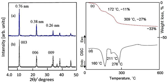 Thermal analyses confirmed the nanolayered structures, as shown in the TG curve and DSC diagram in Figure 5b. The TG curve shows that 28% of the sample was lost after heating up to 305 °C, as seen in Figure 5b. This means that 28% of the content of the sample, which consisted of water, PVA and anions, was confined in the interlayered region. In addition, the hydroxyl groups of the nanolayers, which represent 6%, were removed via heating up to 600 °C. The DSC diagram shows two endothermic peaks and one exothermic peak, confirming TG results. The two endothermic peaks are observed at 139 °C and 275 °C, agreeing with the removal of the interlayered water and anions, respectively. Additionally, the exothermic peak is due to crystallization process after the removal of hydroxyl groups.