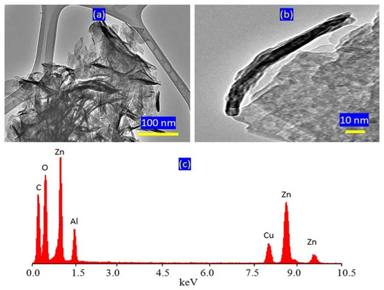 The previous studies showed that natural samples of layered double hydroxides (pyroaurite) have a plate-like morphology. In addition, the dimensions of these plates are in millimeters and not at the nano scale [31]. It is known that the morphology of hydrotalcite, which is carefully crystallized, is a hexagonal platy [33]. A similar morphology is observed for AZ-1, with the dimensions of the plates in the order of 100 nm, as shown in Figure 2a. Additionally, Figure 2a indicates strong aggregates of nanoplates. Via magnification, it was shown that the thickness of the individual plate was 10 nm (Figure 2b). The of energy-dispersive X-ray spectrometry analysis revealed that inorganic elements (zinc and aluminum) were clearly identified in the platelets of sample AZ-1 as shown in Figure 2c. Additionally, interlayered anions were confirmed by signals of carbon and oxygen at low energy. It should be mentioned that the Cu signal, which was observed in the spectrum, is attributed to the copper grid of the TEM testing.
