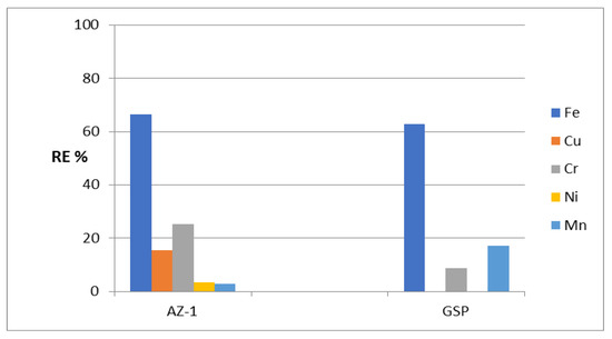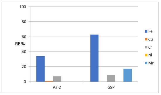 By using AZ-1 as an adsorbent (W/V = 2 g/L), high removal of iron was observed. This shows that the RE% of Fe is 66%, as seen in Figure 3. In the case of the removal of chromium and copper, the percentage became lower because the RE% values of Cr and Cu were 25% and 15%. For nickel and manganese, the AZ-1 sample was not effective where the RE% values of Ni and Mn were 4% and 3%, respectively. The high removal of iron by AZ-1 can be explained by its nanolayered structure.