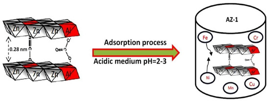 In order to determine the ability of the prepared nanolayered structure AZ-1 to purify water containing heavy metals, adsorption experiments were performed for an aqueous standard solution containing iron (Fe), copper (Cu), chromium (Cr), nickel (Ni) and manganese (Mn) with an extremely acidic medium (pH 2~3). The original concentrations of the analyzed standards are reported in Table 2.