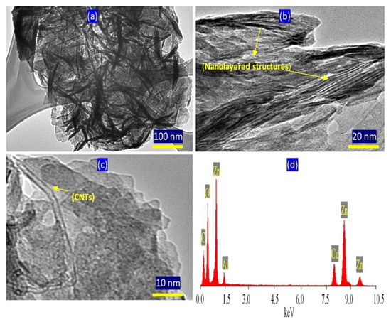 TEM images confirmed the presence of two nanolayered structures. Figure 6a shows clear and large plates with irregular shapes for the normal nanolayered structure of Al/Zn LDHs. The second nanolayered structure, which was modified by CNTs and PVA, is shown in Figure 6a and is marked by yellow arrows. In Figure 6b, the CNTs are clear and marked by a yellow arrow. This means that the nanolayered structures grew around the CNTs, agreeing with the XRD results. EDX analysis confirmed the presence of inorganic species of zinc, aluminum and oxygen, as shown in Figure 6c. Additionally, the CNTs were observed as a clear carbon peak at low energy.