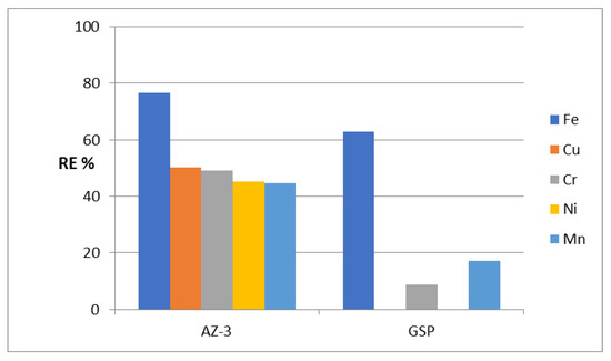 To evaluate its ability to remove heavy metals from water under severe conditions, an adsorption process was used for the five metals iron, copper, chromium, nickel and manganese. High activity was observed for the AZ-3 sample in removing iron from water. Figure 10 shows that 76.6% of iron was removed by the AZ-3 sample. This high activity continued for the removal of both copper and chromium because the RE% values of Cu and Cr were 50.2% and 49.1%. Displaying the same trend, Figure 10 shows high removal of nickel and manganese. Removal percentages of 45.1% and 44.6% were observed for nickel and manganese, respectively.