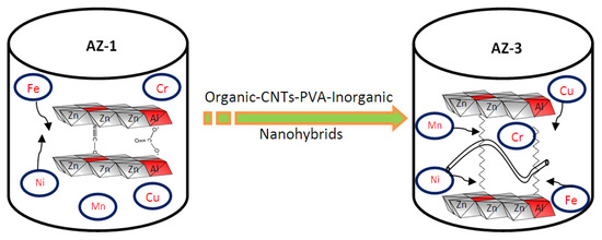 Compared with GreensandPlus, the activity of the AZ-2 sample under severe conditions was lower in the removal of iron and chromium. Additionally, for copper, the activity was very low. In the case of nickel and manganese, the AZ- 2 sample was completely inactive. The low activity of the AZ-2 sample can be explained by the presence of CNTs and PVA. The H-bonding of the PVA chains and CNTs caused narrowing by 50% of the interlayered spacing of the nanolayered structure, from 0.750 nm to 0.681 nm. This means that CNTs and PVA occupied part of the empty space among the nanolayers of the AZ-2 sample. In addition, they caused a blockage of the entrance gate of the interlayered region of the nanolayered structures. These effects led to a weakened ability of the nanolayered structures in the removal of heavy metals from water.