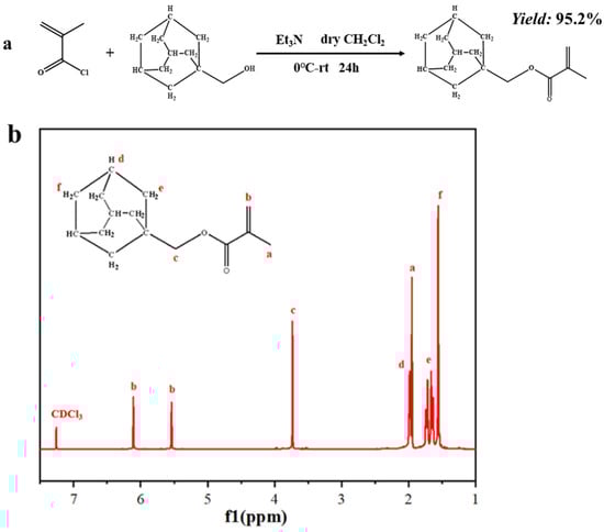 Triethylamine and 1-adamantane methanol were dissolved in 200 mL anhydrous DCM in a glove box, followed by the addition of MAC at 0 °C. The reaction mixture was allowed to warm slowly to room temperature and stirred for 24 h. The insoluble salts were filtered and the filtrate was then extracted with a saturated NaCl solution, 1 M HCl, 1 M NaHCO3, and saturated NaCl solution. The organic phase was dried over anhydrous Na2SO4 and filtered; the solvent was removed on a rotary evaporator to obtain a colorless viscous liquid that solidified in the refrigerator to a white solid (yield: 95.2%). The schematic illustration of the synthesis of AdaMMA and the 1H-NMR spectra are displayed in Figure 1a,b.