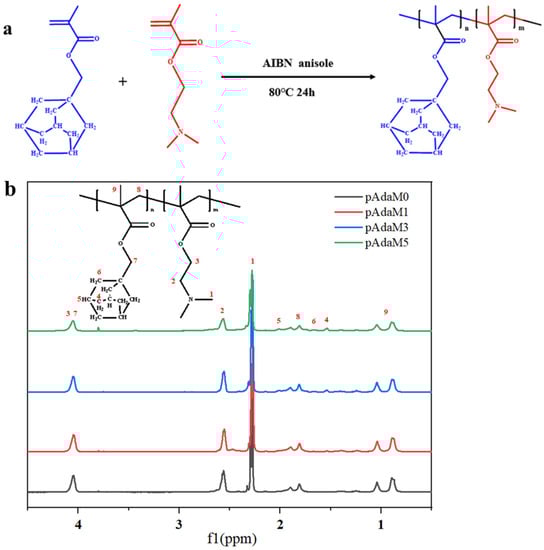 PAdaMX was prepared by changing the feeding ratio of DMAEMA and AdaMMA whilst maintaining the same amount of AIBN (Table 1). The monomer consumption was calculated by the integration of the signal of the DMAEMA and AdaMMA vinyl groups (CHH=C CH3, 6.11 ppm, or 5.56 ppm) against the internal standard (anisole, o,p Ar-H, 6.91 ppm) [36]. A certain amount of DMAEMA, AdaMMA, and AIBN was dissolved in anisole. The flask was immersed in an oil bath at 80 °C and the reaction was stopped after 24 h. The product was purified by 3 precipitations from n-hexane and dried under a vacuum for 12 h at 40 °C. The schematic illustration of the synthesis of PAdaMX and the 1H-NMR spectra is displayed in Figure 2a,b.