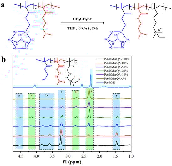 PAdaM3QA−X with a different degree of quaternization was synthesized by changing the amount of bromoethane (Table 2). PAdaM3 was dissolved in THF in a 50 mL flask and sealed in a glove box, followed by the addition of different volumes of bromoethane at 0 °C. The reaction mixture was allowed to slowly warm to room temperature and stirred for 24 h. The product was purified by 3 precipitations from n-hexane and dried under a vacuum for 12 h at 40 °C. The PAdaM3QA−100% sample was precipitated after the reaction was completed, washed with n-hexane 3 times and dried under a vacuum for 12 h at 40 °C. The schematic illustration of the synthesis of PAdaM3QA with different degrees of quaternization and the 1H-NMR spectra are displayed in Figure 3a,b.
