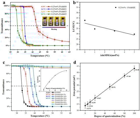 (a) The transmittance of 0.25 wt% PAdaMX solution; (b) the effect of AdaMMA addition on LCST of PAdaMX solution; (c) the transmittance of PAdaM3QA−X solution; (d) the zeta potential of PAdaM3QA−X solution with different degrees of quaternization.