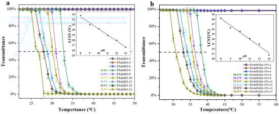 To further investigate the effect of pH on the temperature-responsive properties of the PAdaMX and PAdaM3QA−X solutions, PAdaM3 and PAdaM3QA−10% were selected for further studies in order to avoid the inaccuracy of the LCST caused by a wide temperature variation range (the range where transmittance decreased from 100% to approximately 0%) as the narrowest variation ranges were observed in the PAdaM3 and PAdaM3QA−10% solutions among the PAdaMX and PAdaM3QA−X solutions, as shown in Figure 4a,c. Therefore, PAdaM3 and PAdaM3QA−10% were prepared into 0.25 wt% aqueous solutions with pH = 2, 4, 6, 8, 9, 10, 11, 12, and 13 for UV-Vis testing.