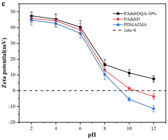 (a) The transmittance of PAdaM3 solution at different pHs; (b) the transmittance of PAdaM3QA−10% solution at different pHs; (c) the zeta potential of PAdaM3QA−10%, PAdaM3, and PAdaM0 solutions at different pHs.