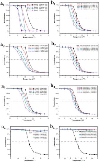 The effect of salt addition on the transmittance of PAdaM3 solution: (a1) NaCl; (a2) NaBr; (a3) KI; (a4) NH4Cl. The effect of salt addition on the transmittance of PAdaM3QA−10% solution: (b1) NaCl; (b2) NaBr; (b3) KI; (b4) NH4Cl.