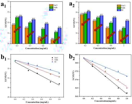 Interestingly, the influence on the LCST decreased in the order of NaCl, NaBr, and KI under the same ion concentration (Figure 7(a1,a2)). This could be explained by the combined effect of ionic binding and electrostatic screening. The anion could directly bind to the positively charged protonated tertiary amine group in the solution, which enhanced the extension of the polymer chains in the solution and thereby increased the LCST of the solution. This process partially offset the electrostatic screening [46]. Moreover, although the valence state of the ions was the same, the different binding constants could also make the solution LCST decrease differently under the same concentration. However, as the concentration of the ion increased, the ion binding was saturated and the LCST decreased due to the increase in the electrostatic screening effect. The ability of the anions to decrease the LCST of the solution was similar to the Hoffman sequence [47,48]; that is, Cl− > Br− > I−.