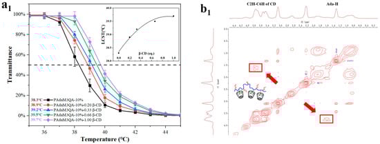Figure 8(a1–a3) depict the change in LCST after the addition of different masses of β-CD. Taking the fitting curves into account (inset of Figure 8(a1,a2)), the results demonstrated that the LCST of the PAdaM0 solution had no significant change when β-CD was added, but the LCST of the PAdaM3 and PAdaM3QA−10% solutions displayed an upward trend with the increasing addition of β-CD. We speculated that β-CD had a good host–guest interaction with the adamantyl group in PAdaM3 and PAdaM3QA−10% in aqueous solutions so that the hydrophobic adamantane moiety was wrapped in the inner cavity of β-CD; the hydrophilic outer rim of β-CD helped to improve the hydrophilicity of the polymers, which increased the LCST of the solution [49,50]. However, there was no adamantyl group in PAdaM0, which indicated that adding β-CD had no obvious effect on the LCST of the PAdaM0 solution. The host–guest interactions were further proven by the results of 2D-NMR NOESY. There were cross-peaks of interaction between PAdaM3/PAdaM3QA−10% and β-CD in the mixed solution of PAdaM3/PAdaM3QA−10% and β-CD (Figure 8(b1,b2)); however, no cross-peak could be found in the spectraof the PAdaM0 and β-CD mixed solution (Figure 8(b3)).