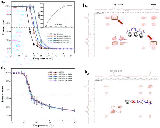 The effect of β-CD on the LCST of (a1) PAdaM3QA−10%, (a2) PadaM3, and (a3) PAdaM0 solutions; partial 2D NMR NOESY spectra of the mixture of β-CD and (b1) PAdaM3QA−10%, (b2) PAdaM3, and (b3) PAdaM0 in water at 30 °C.