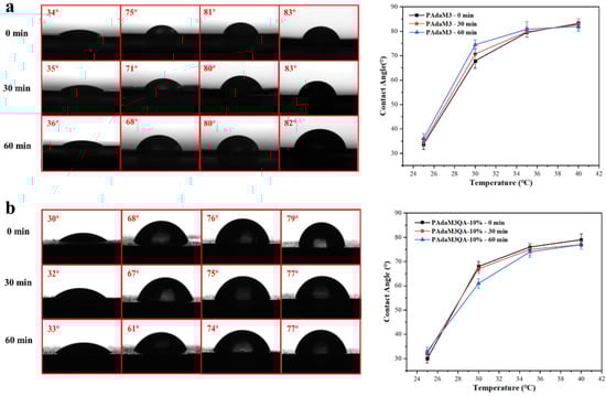The water contact angle (WCA) of the PAdaM3 and PAdaM3QA−10% coatings was then measured (Figure 9a,b) and the stability of their temperature-responsive performance was tested. The WCA of the PAdaM3 and PAdaM3QA−10% coatings both drastically increased in the range of 25–30 °C, increasing by more than 30°; the uptrend of the WCA with the increase in the temperature slowed down after 30 °C. As the phase transition of the DMAEMA moiety of the coating fell in the range of 25–30 °C, the hydrophilicity of the coatings was greatly reduced due to the collapse of the hydrophilic segment. In addition, we speculated that the reason for the deviation of the phase transition temperature of the coating and the solution was that the density of the polymer on the surface of the substrate in contact with water was higher than the concentration of the polymer in the solution during the UV-Vis test; thus, the transition temperature of the coating decreased and fell between 25–30 °C. It was notable that the WCA of PAdaM3QA−10% was slightly smaller compared with PAdaM3, indicating that the hydrophilicity was improved after quaternization.
