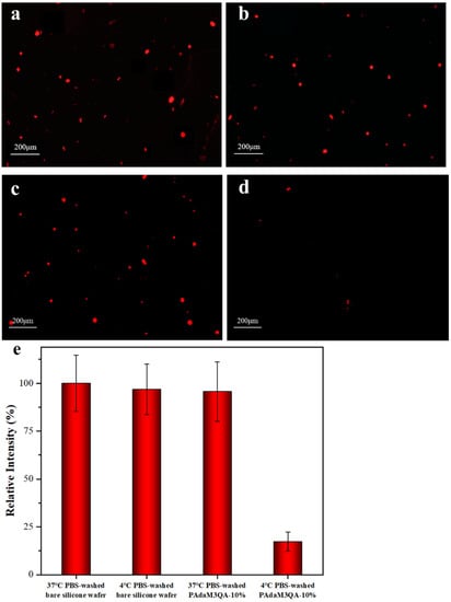 The results of the fluorescence micrographs as shown in Figure 10a–d showed that, compared with the wafers washed with PBS at 37 °C, less BSA adhered to the wafers washed with PBS at 4 °C and the fluorescence intensity of the PAdaM3QA−10%-coated silicon wafers washed with the phosphate buffered saline (PBS) solution at 4 °C decreased by 78.4% (Figure 10d). However, there was no obvious effect on the fluorescence intensity of the bare silicon wafers when they were washed at 37 °C or 4 °C. The mechanism of the release of BSA was attributed to the temperature responsiveness of the PAdaM3QA−10% coatings mentioned in Section 2.5. Upon being rinsed with PBS at 37 °C, the ambient temperature was above the LCST of the coatings (25–30 °C) and the PBS buffer solution contained salt ions, which resulted in the collapse of the DMAEMA moiety. Contrarily, the side chains of PAdaM3QA−10% changed from a collapsed state to an extended state when rinsed with PBS at 4 °C, accompanied by the desorption of BSA at the same time.