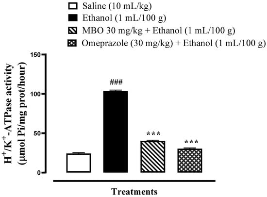 The inhibitory effect of MBO on gastric H+/K+-ATPase of rats was analyzed by using the colorimetric method [16]. The commercially available colorimetric H+/K+-ATPase activity assay screening kit (Catalog No: E-BC-K122-S; Elabscience) was used for analysis. Stomach tissues kept in a bio-freezer (−80 °C) were homogenized and then subjected to centrifugation at 3500 rpm for 10–15 min to obtain a supernatant. The supernatant collected was then analyzed for the release of inorganic phosphate after ATP hydrolysis spectrophotometrically at 660 nm. Here, 1 ATPase activity unit is defined as 1 µmol of inorganic phosphorus released by ATP hydrolysis by ATPase of 1 mg of tissue protein per hour. Findings were then expressed as µmol Pi/mg prot/h.