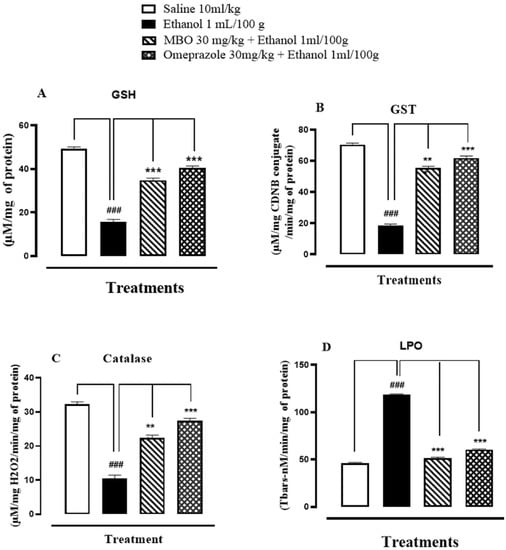 (A–D) Bar graph representing the effect of MBO and omeprazole against reduced glutathione (GSH), glutathione-s-transferase (GST), catalase and lipid peroxidation (LPO) in ethanol-induced gastric ulcer tissues. Values expressed as mean ± SEM (n = 3). One-way ANOVA, with posthoc Tukey’s test. ### p < 0.001 vs. saline group, *** p < 0.001 vs. ethanol groups.