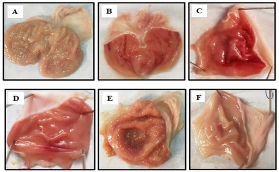 Gross appearance of gastric mucosa in rats: (A) treated with saline 10 mL/kg. (B) Severe lesions are observed with absolute ethanol (1 mL/100g) treatment along with hemorrhagic necrosis of gastric mucosa. (C–E): MBO treatment groups at doses of 5 mg/kg, 10 mg/kg and 30 mg/kg, respectively. (F) Pre-treated with omeprazole (30 mg/kg). The gastric lesions were reduced with increased doses of MBO and omeprazole compared to ulcer control. At 30 mg/kg, MBO showed the most effective gastro-protective action.