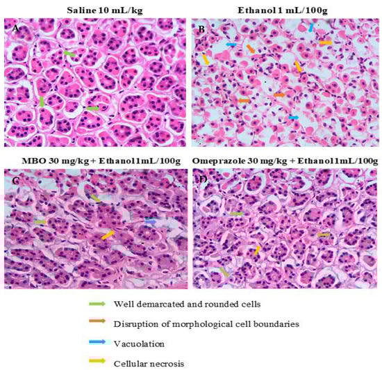 Effect of MBO on ethanol-induced stomach ulcers analyzed by histopathological technique. Gastric tissues (n = 5) from each experimental group were processed for histological changes after 1 h of ethanol treatment. Magnification 40×. (A) Saline 10 mL/kg; (B) ethanol 1 mL/100g; (C) MBO 30 mg/kg + ethanol 1 mL/100g; (D) omeprazole 30 mg/kg + Ethanol 1 mL/100g. Green, orange, blue, and yellow arrows represent well-demarcated and rounded cells, disruption of morphological cell boundaries, vacoulation and cellular necrosis, respectively.
