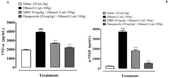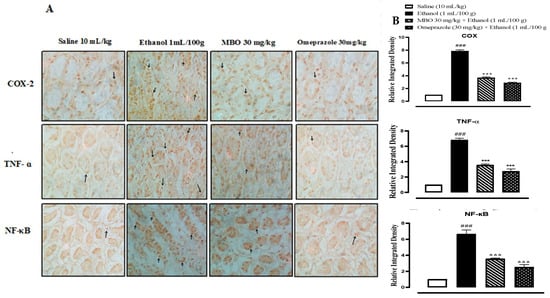 In the ethanol group (1 mL/100g), the expression of COX-2, TNF-α and p-NFkB is increased in gastric tissues (### p < 0.001 versus saline group). In the MBO (30 mg/kg) and omeprazole (30 mg/kg) treatment groups, their expression is significantly reduced (*** p < 0.001 versus ethanol group), as presented in Figure 6A,B.